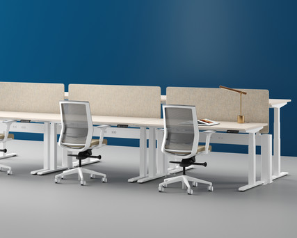 Benching workstations are an economical and modern solution for outfitting workers in a open-plan layout or "co-working" space. Benching workstations cost less than traditional cubicles because they eliminate the use of panel walls. Benching workstations feature a sleek, minimalist design with long shared worksurfaces that allow for open communication and collaboration. Also available with privacy panels.